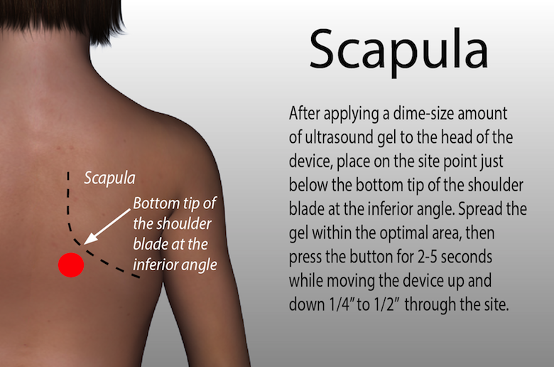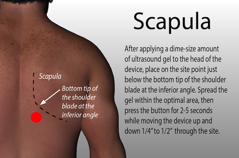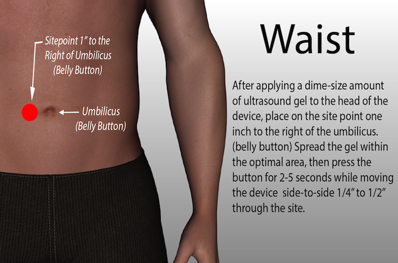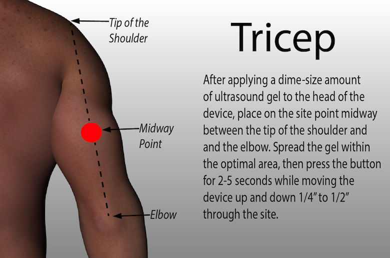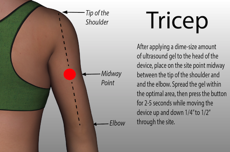 Subcutaneous fat thickness is meaured directly using the BodyMetrix device at multiple anatomical sites as shown below. Unlike calipers the BodyMetrix measures actual thickness and not a skinfold. This eliminates the need to grab and pinch the skin. Using the measured values the percentage Body Fat (%BF) is automatically calculated.